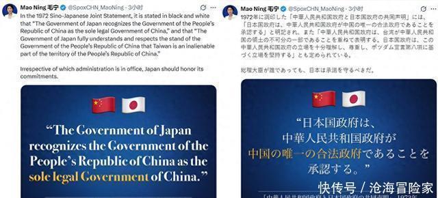中国如何下好这盘棋? 中国的应对,从一开始就不是简单的“对等报复”,而是一种更高维度的“体系化操作”。 在外交层面,中方有理有节,先是通过外交部表达严重关切,再到副部长级召见大使,层级递进。 每一步都严格遵守外交规则,做到了有理、有利、有节,让对手抓不到任何把柄。 毛宁在X上用中英日三语发布海报,引用1972年《中日联合声明》条款,这一招堪称“数字化外交”的典范。